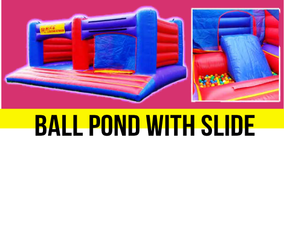 A bouncy castle with a small slide into a ball pond.