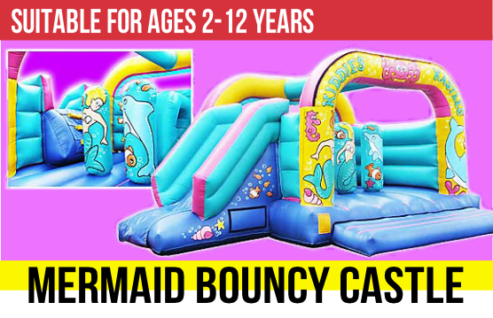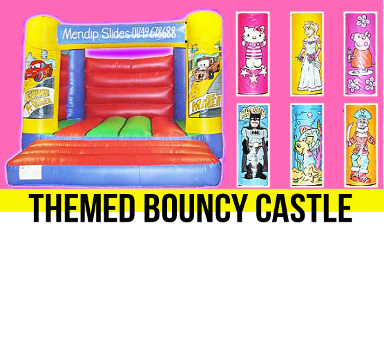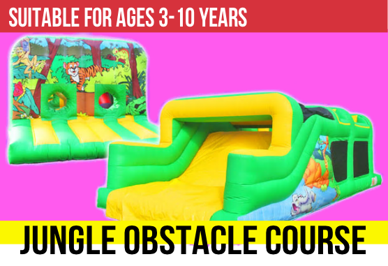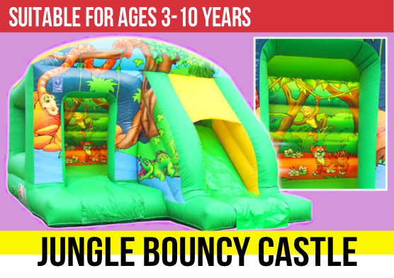 A Bouncy Castle with a Jungle theme and a slide that comes out the front. Comes with a shower cover.