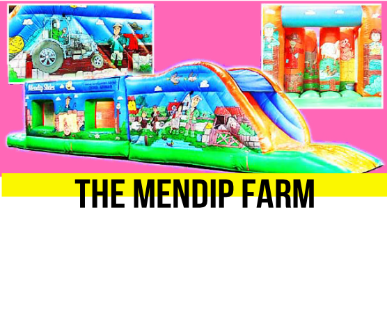 A long assault course with obstacles and a slide, with farming theme.