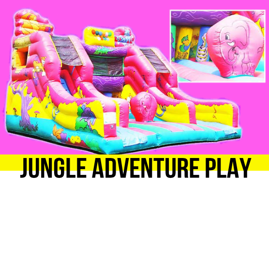 This adventure play includes a 7 foot sldie, bish bash and a bounce area with a jungle theme.