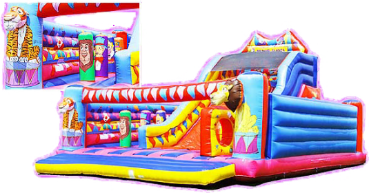 This is a giant bouncy castlewhich includes a 12 foot platform slide, bish bash, jumpthrough holes and a bounce area with a circus theme